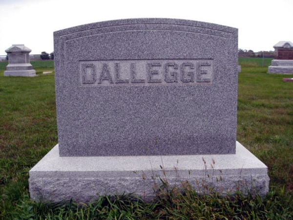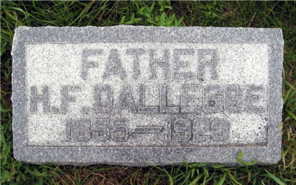 - Birth Date:2/12/1855Death Date:4/10/1923Spouse:Augusta Hinze DalleggeParents:August and Wathelmine (Hubscher) DalleggeChildren:Fred, Emma (Heins) infant daughter, WelhelmObituary:Notes:Grave location:Lot 19, Grave 1