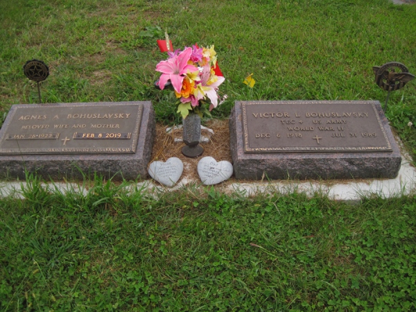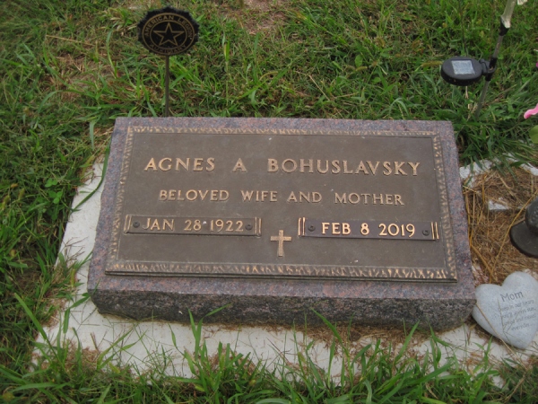 - Birth Date:1/28/1922Death Date:2/8/2019Spouse:Victor L.Parents:Frank and Anna Bartek MatulkaChildren:Victor J., Kenneth J., Donald J., Joyce (Rezac), Kathleen (Janak), Mary Kay (Koontz)Obituary:Notes:Grave location:Block C27, Lot 5