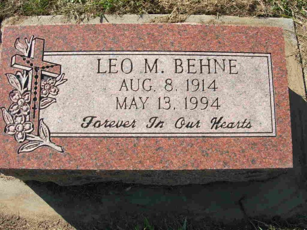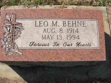 - Birth Date:8/8/1914Death Date:5/13/1994Spouse:Alice E. (Helman) BehneParents:Andrew J. and Julia (Toman) BehneChildren:Leo E., Larry, Joyce (Birkel), Eileen (Kuzelka), Allan, Nancy (Winters), Michael, MarkObituary:Notes:Grave location:Block C12, Lot 2