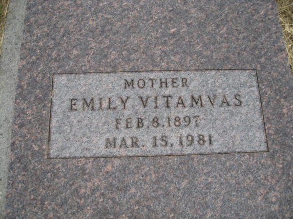 - Birth Date:2/8/1897Death Date:3/15/1981Spouse:Emil F. VitamvasParents:Anton and Mary (Kubicek) TravnicekChildren:Josephine(Heikel), Irene(Kroeger), Libbie, Emily(Kohler).Obituary:Notes:Grave location:Section South, Lot 17