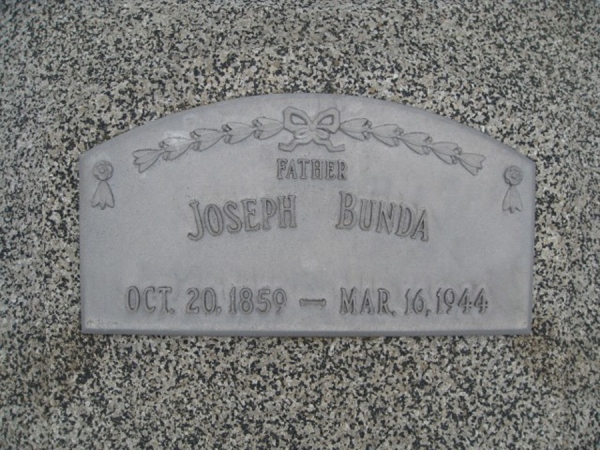 - Birth Date:10/20/1859Death Date:3/16/1944Spouse:Marie CipperaParents:James and Josephine(Hynek) BundaChildren:Edward, Bessie, Josephine (Macholan), James, EmilObituary:Notes:Grave location:Section North, Lot 22