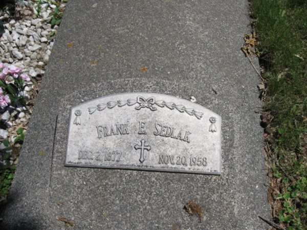 - Birth Date:12/2/1877Death Date:11/2/1958Spouse:Mary Rech SedlakParents:John and Frances Hladky Sedlak.Children:Frank Jr., Lucille (Hamata), John, Mary Mae (Houdek), Ann (Novak), Albin, Margaret "Marge" (Wegrzyn), Beatrice (Suchy), Agnes (Foral), ErnestObituary:Notes:Grave location:Section Center, Block 2, Row 13, Grave 2
