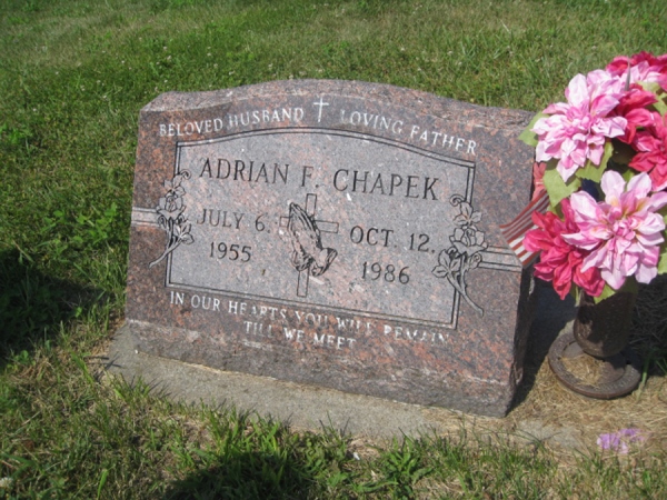 - Birth Date:7/6/1955Death Date:10/12/1986Spouse:Gail EggeParents:Adolph and Celestine (Skoda) ChapekChildren:Adrian Jr., Daniel, Annie.Obituary:Notes:Grave location:Section 2, Lot 16, Grave 5