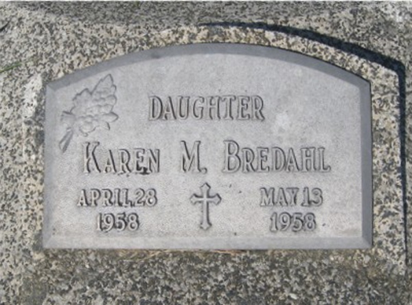 - Birth Date:4/28/1958Death Date:5/13/1958Parents:Roger and Maxine (Kozisek) BredahlObituary:Notes:Grave location:Section 5, Lot 53, Grave 7