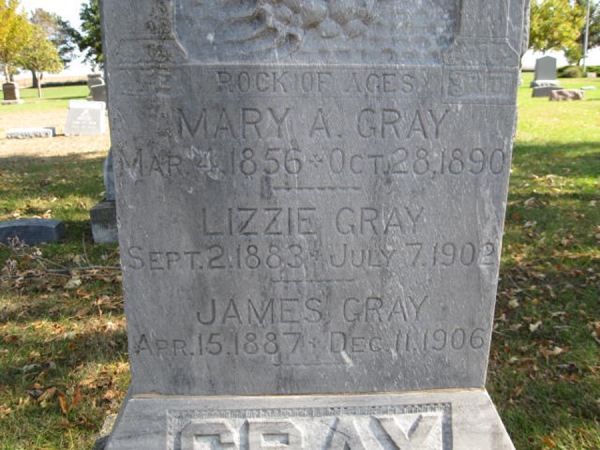 - Birth Date:3/4/1856Death Date:10/28/1890Spouse:Owen GrayChildren:Lizzie, James, Eugene, Michael, Mary,Obituary:Grave location:Block 13, Lot 3, Grave 2
