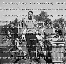 Parade Scenes. Businesses. 10 negs. Man and two women on small tractors with prizes.